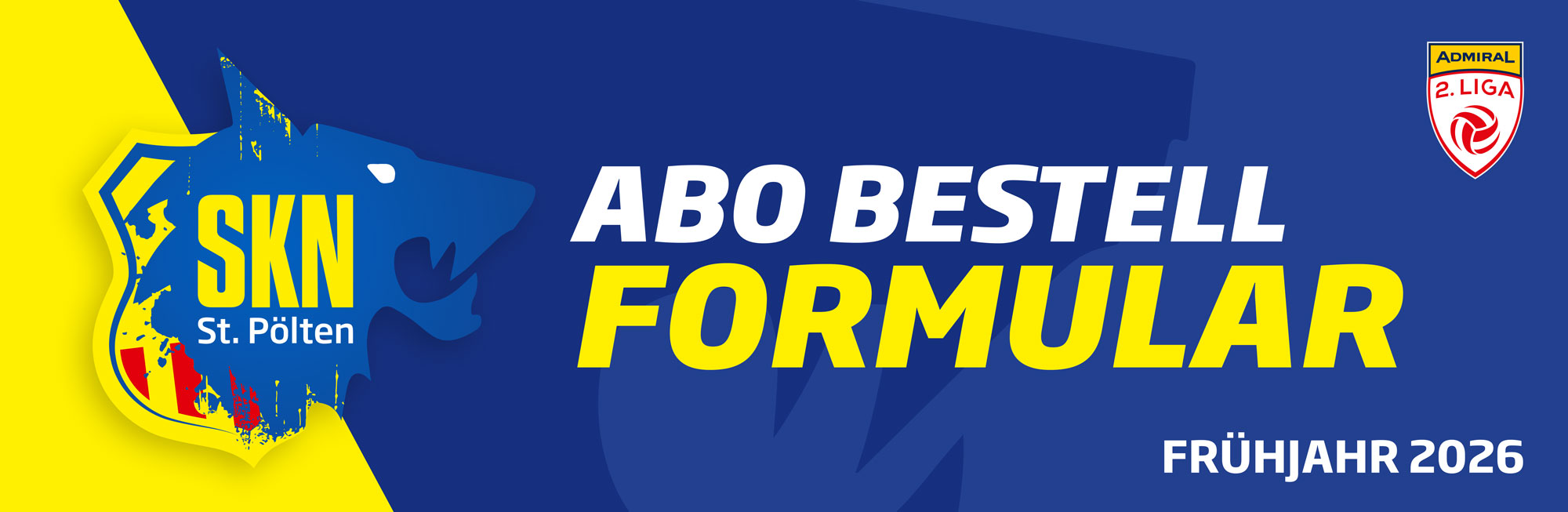 Hol Dir jetzt das SKN-Frühjahrs-Abo 2025/2026!Unterstütze das Wolfsrudel auch im Frühjahr der Saison 2025/2026 live im Stadion und sichere Dir jetzt das Abo für alle Heimspiele der Admiral 2. Liga sowie etwaige Relegations- und Freundschaftsheimspiele in der NV-Arena.Prozedere für Bestellungen über das neue ONLINE-Formular:1) Formular ausfüllen (mit * gekennzeichnete Felder sind Pflichtfelder)2) Betrag an folgende Bankdaten überweisen:Kontoinhaber: SKN St. Pölten GmbHBank: Sparkasse, IBAN: AT65 2025 6000 0094 41163) Nach dem Zahlungseingang senden wir das Abo + Rechnung per Post zu.Wir freuen uns auf Dich!#weareone